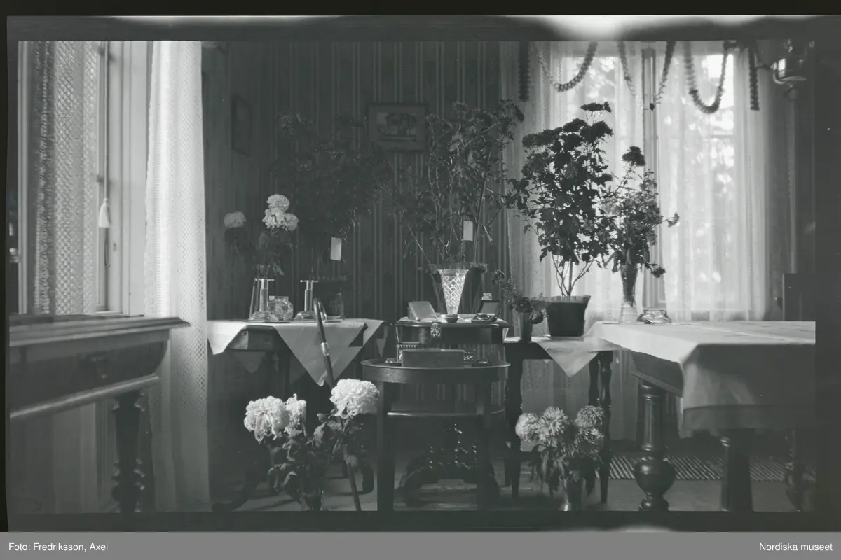 Presenter, krukväxter och blombuketter står på bord och golvet i ett rum.
