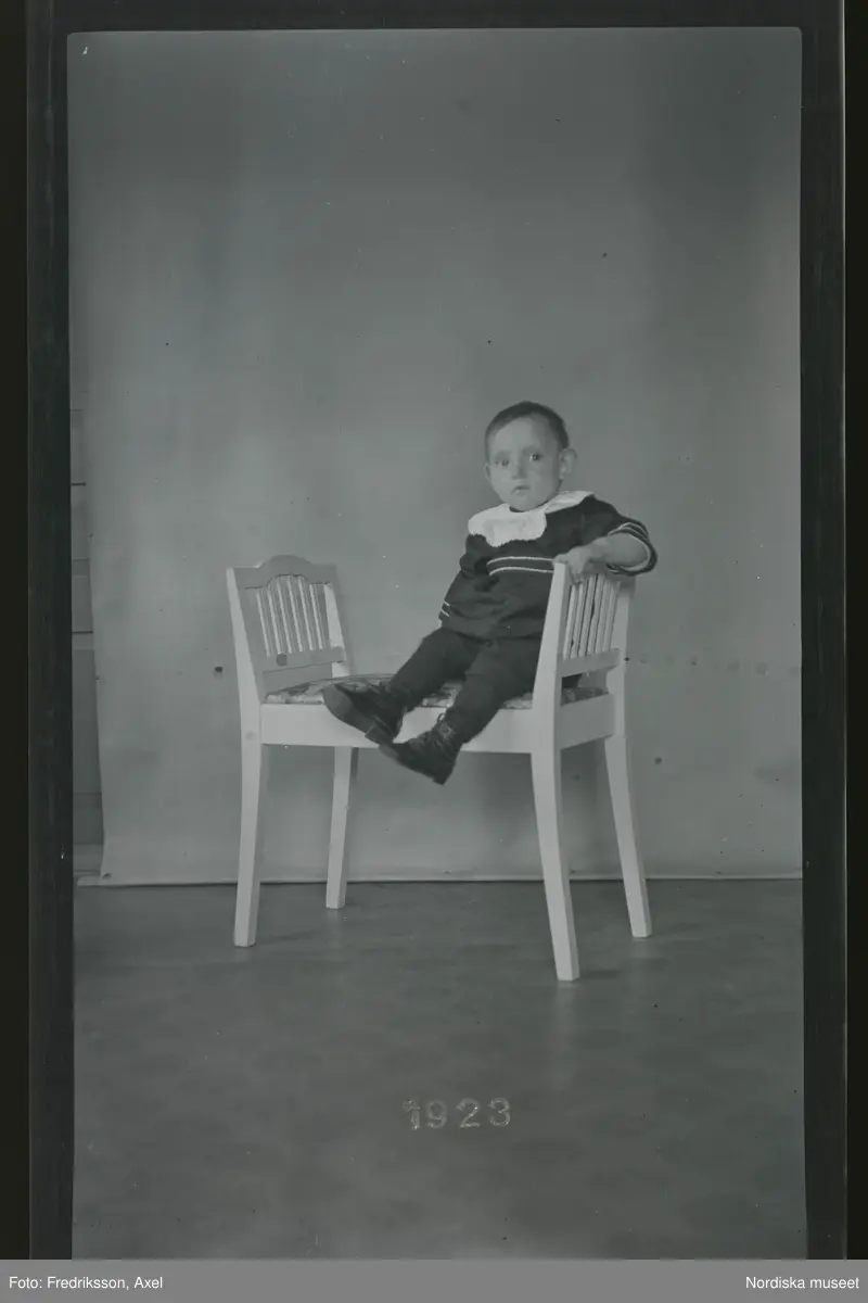Titel: Porträtt av ett barn, sittande på en vit pall.