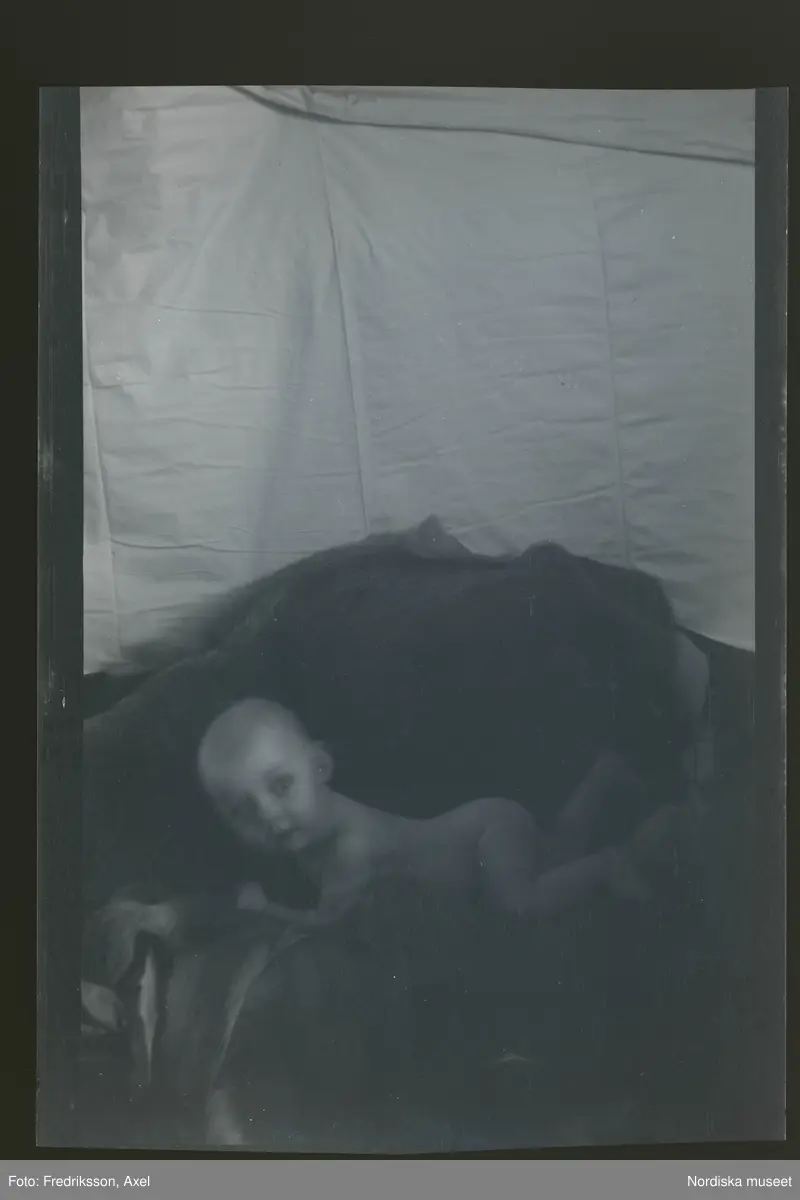 Ett litet barn porträtterat liggandes på en renkinnsfäll.