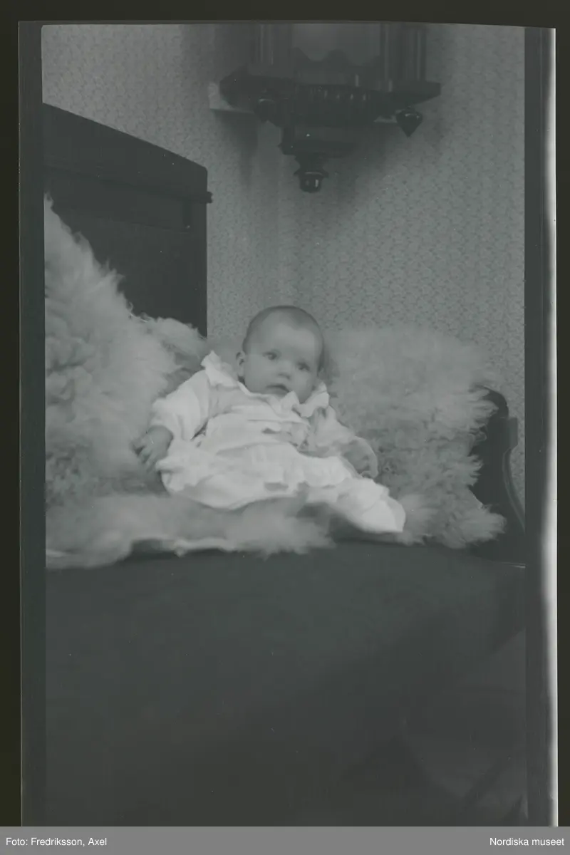 Ett litet barn porträtterat på en fårskinnsfäll i en soffa.