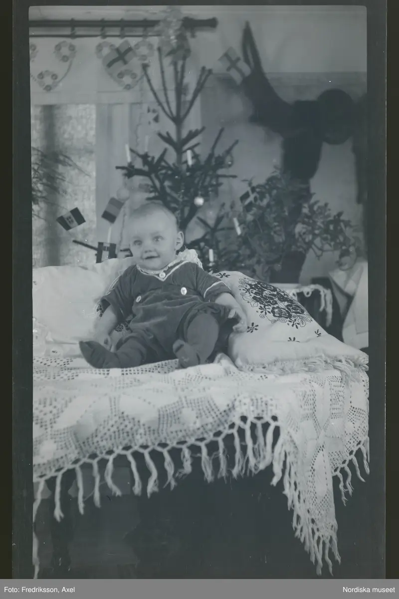 Porträtt av ett barn sittandes på ett bord, stödd av kuddar.