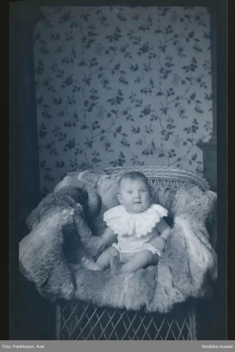 Porträtt av ett litet barn sittandes på en fäll av päls i en korgstol.