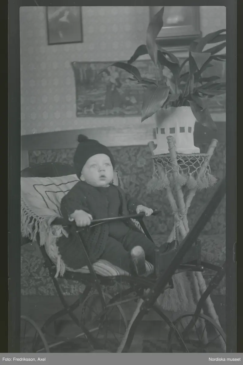 Porträtt av ett litet barn med mössa på huvudet, sittandes i en barnvagn inomhus.