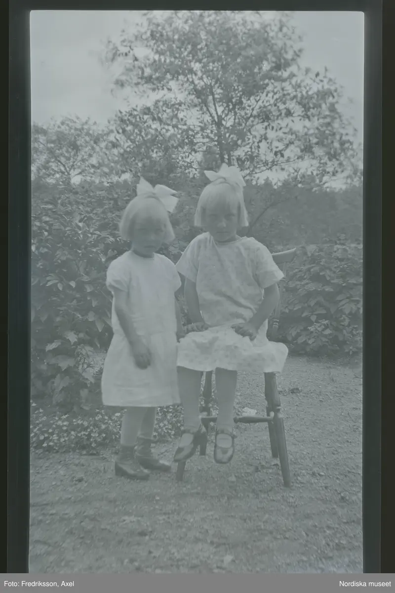 Två flickor med rosetter i håret porträtterade utomhus. Den ena sitter på en stol, den andra står bredvid.