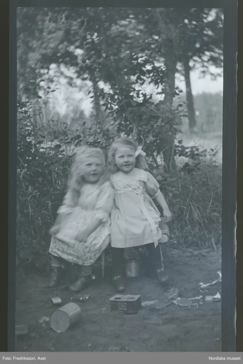 Två små flickor sitter på en pall i en trädgård. Framför dem ligger saker de lekt med.