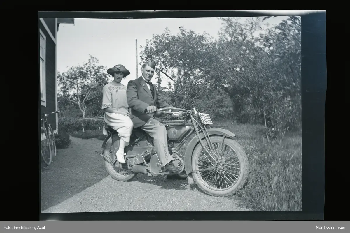 En man på motorcykel i en trädgård, en kvinna sitter bakom honom och får skjuts.