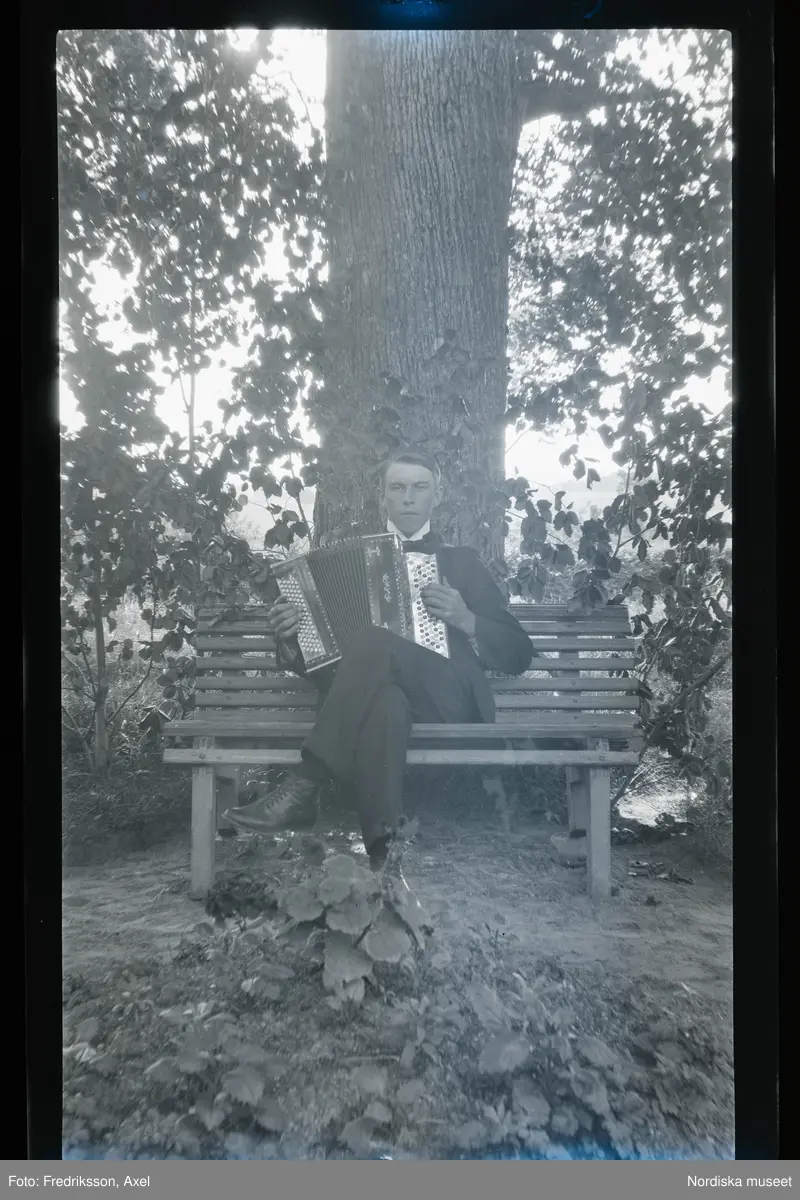 Gunnar Karlsson, Fogelstad, sitter i en trädgårdssoffa under ett träd och spelar dragspel.