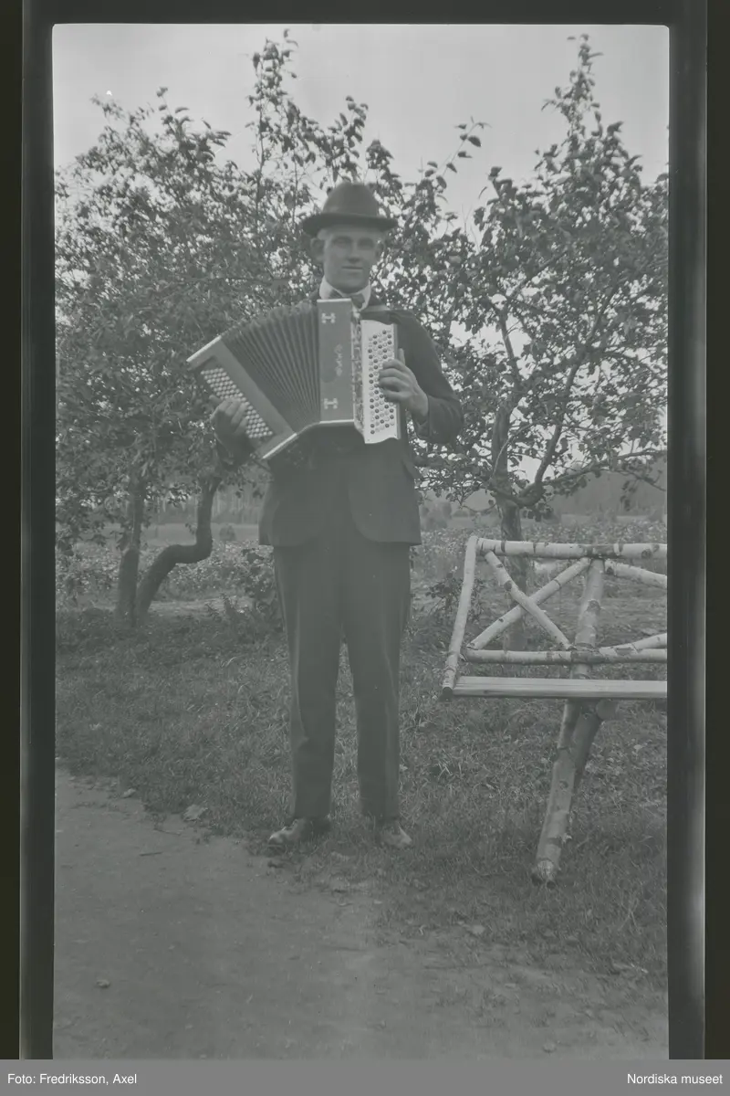 Harry Karlsson, Fogelstad, står i en trädgård och spelar dragspel.