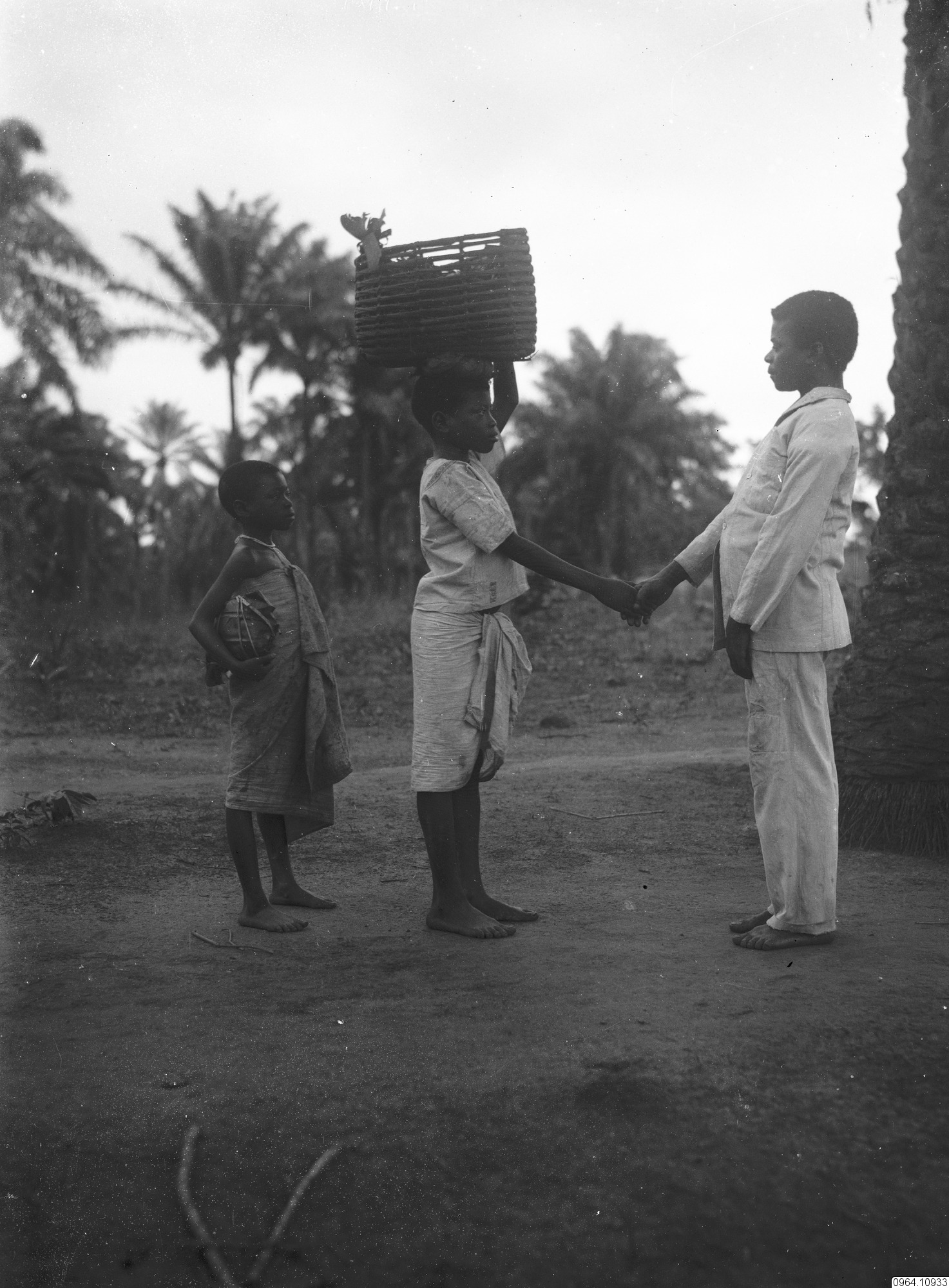Tre barn, två pojkar och en flicka. Flickan bär en korg på huvudet och hälsar på den äldre pojken med ett handslag. Eller så håller bara varandra i handen?
