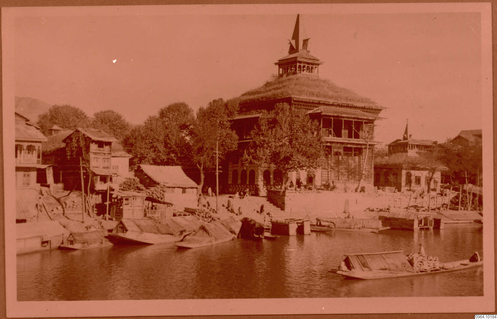 Repro av påsikt. The Khanqah-e-Moula Kashmiri: خانقاہِ معلیٰ), also known as Shah-e-Hamadan Masjid and Khanqah, is a Sunni mosque located in the Old City of Srinagar in Jammu and Kashmir, India. Situated on the right bank of the river Jhelum between the Fateh Kadal and Zaina Kadal bridges, it was built in 1395 CE, commissioned by Sultan Sikendar in memory of Mir Sayyid Ali Hamadani. It is held to be the first Khanqah—mosques associated with specific saints—in the Kashmir valley. It is one of the best examples of Kashmiri wooden architecture, and is decorated with papier mache. The mosque structure is a Monument of National Importance.