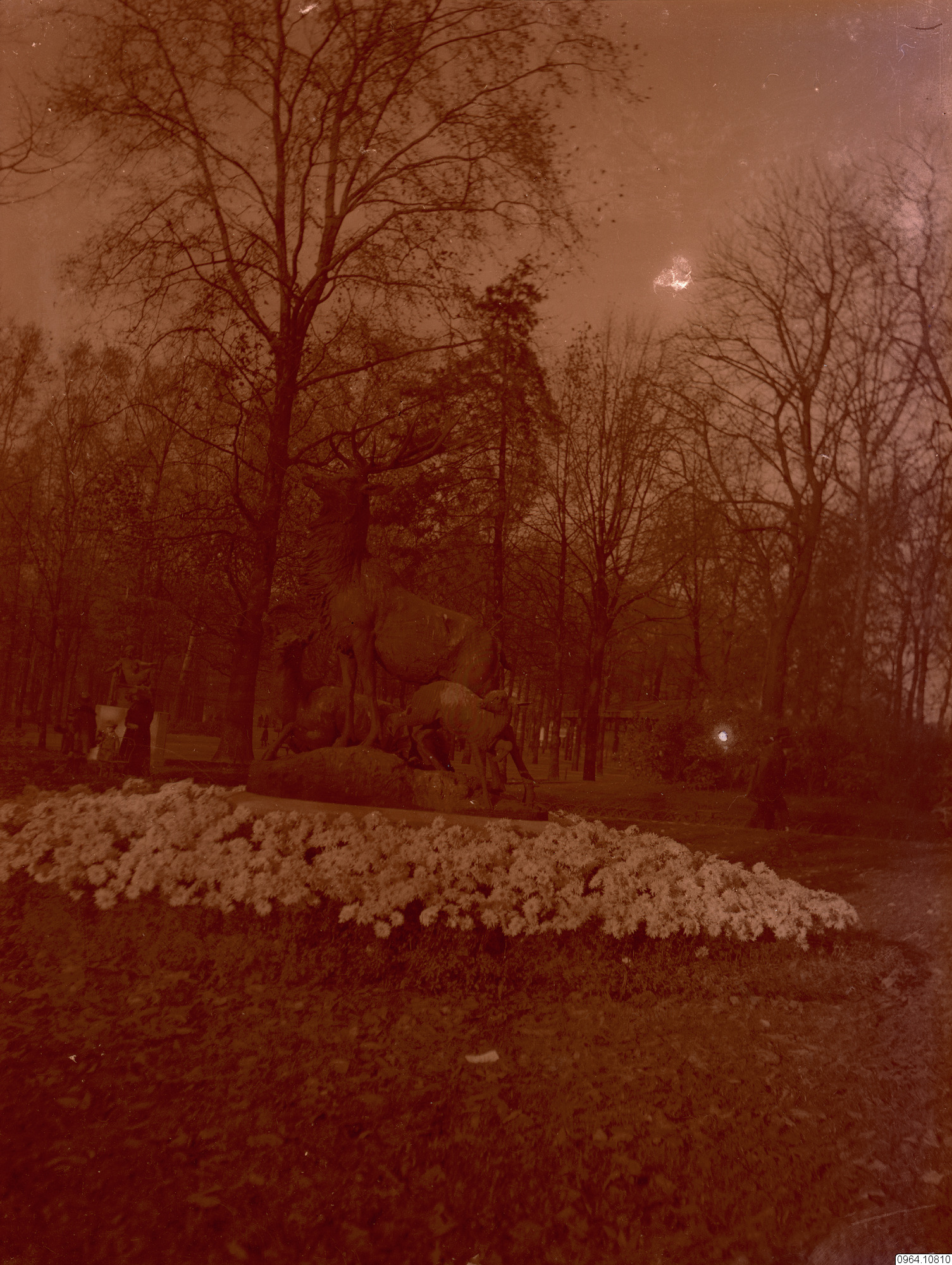 Staty av kronhjort och blommor. the bronze statue group called Harde de Cerfs, which translates in English to Herd of Deer, yet this is also sometimes referred to as La Harde de cerfs ecoutant le rapproche, which then translates to The Herd of deer listening close. Jardin du Luxembourg.