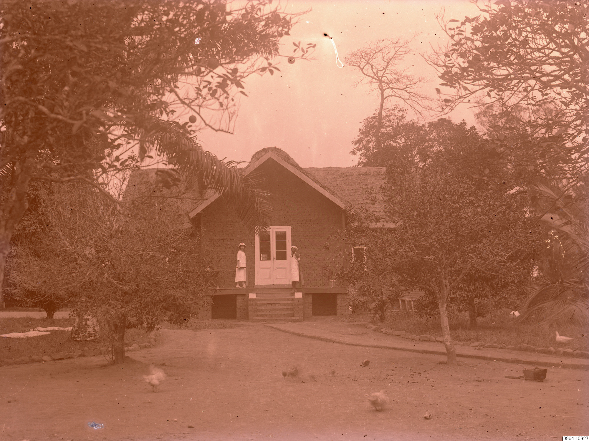 Två kvinnor på trappan utanför huset. Hönor på gården. Jämför bild 0964.4115.
