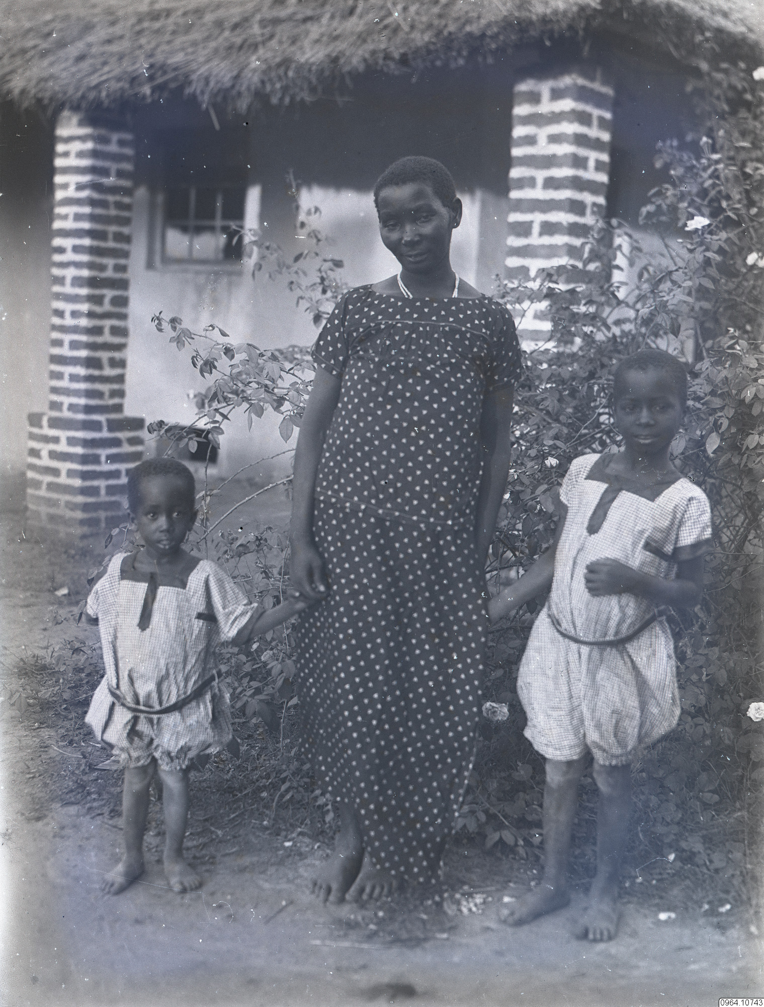 Kvinna (mamma?) och två barn framför missionshus (?) i tegel.