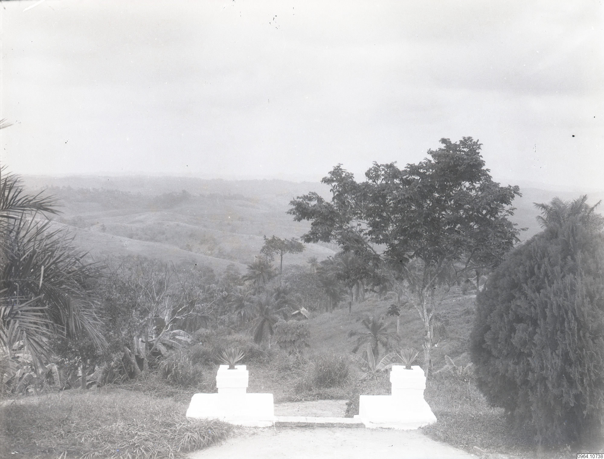 Utsikt, sannolikt från missionsstation och boningshus med trappa i förgrunden.
