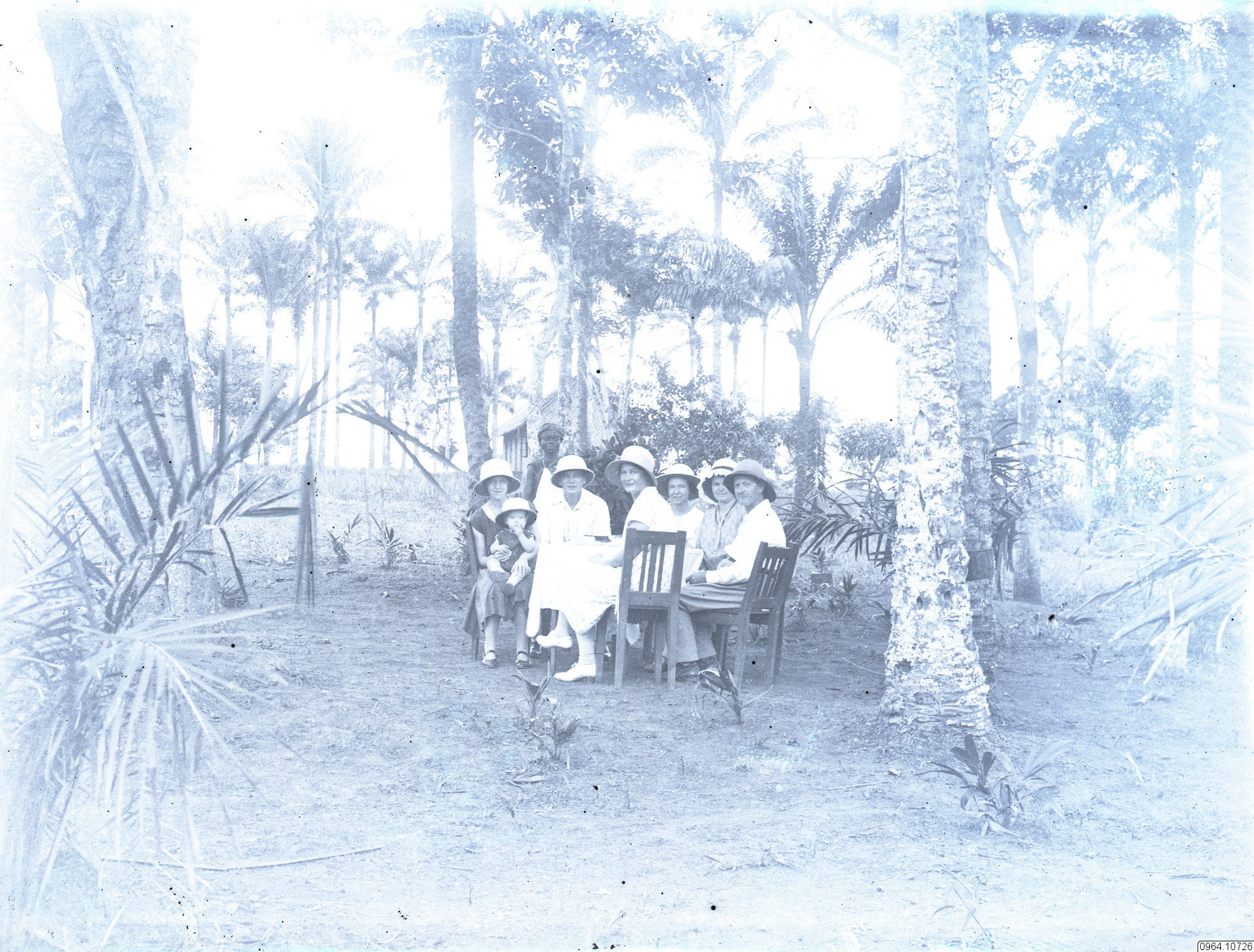 En grupp missionärer sitter med stolar och bord i trädgården och kanske fikar.