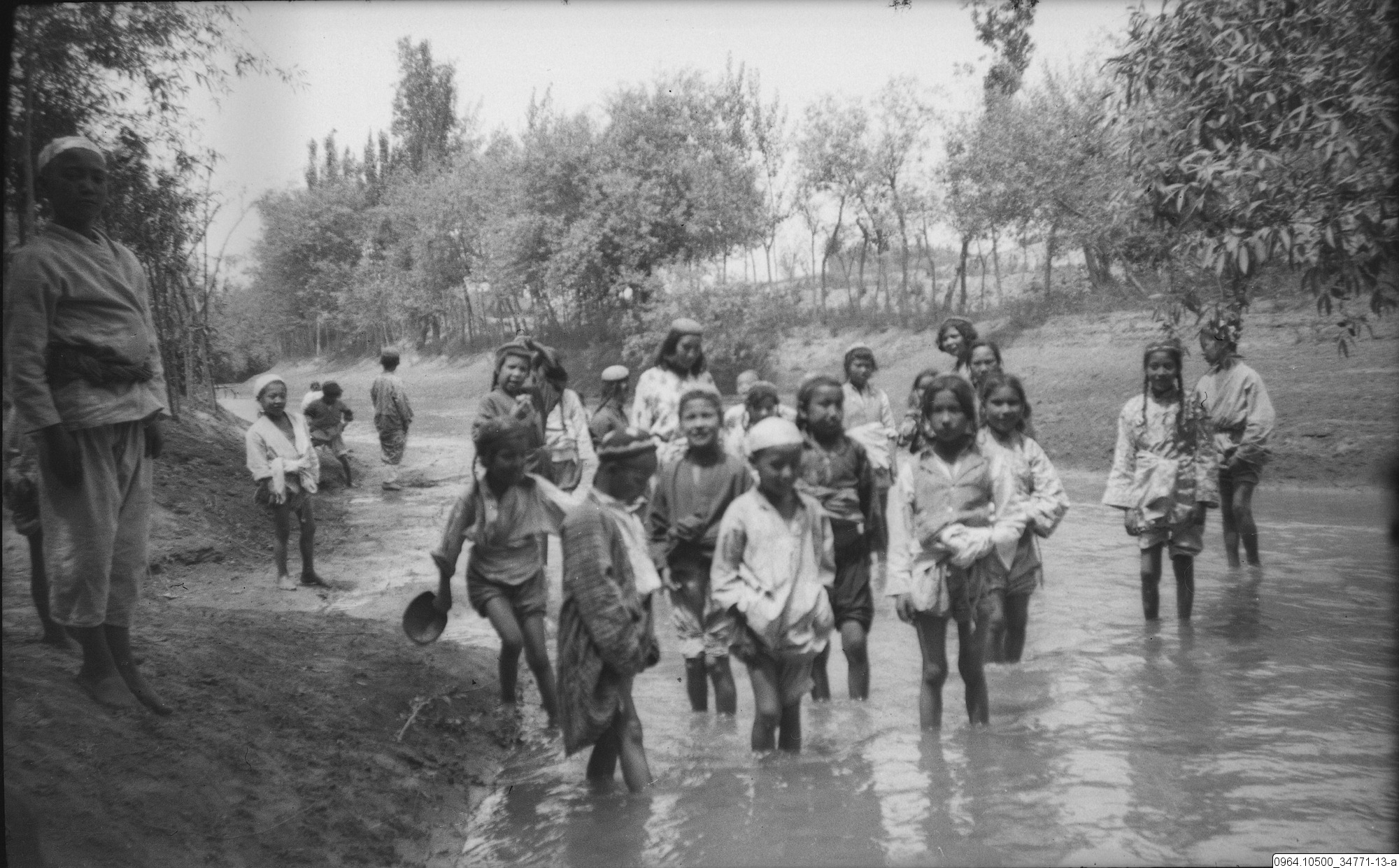 Barn som står i en liten flod/rinnande vatten. Indien eller Kina?