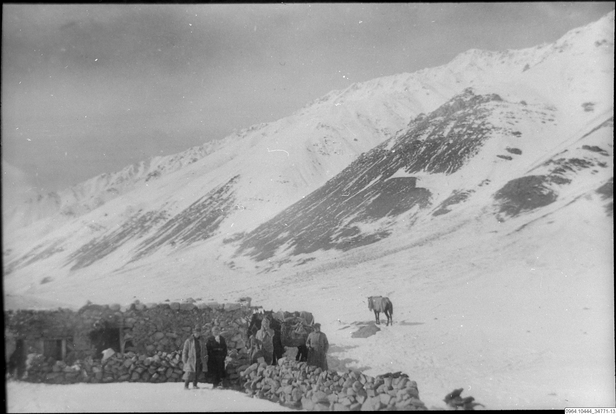 Flera personer (fem?) står vid ett stenhus vid foten av ett berg. Rastplats under karavanfärd? En häst står en bit bort.