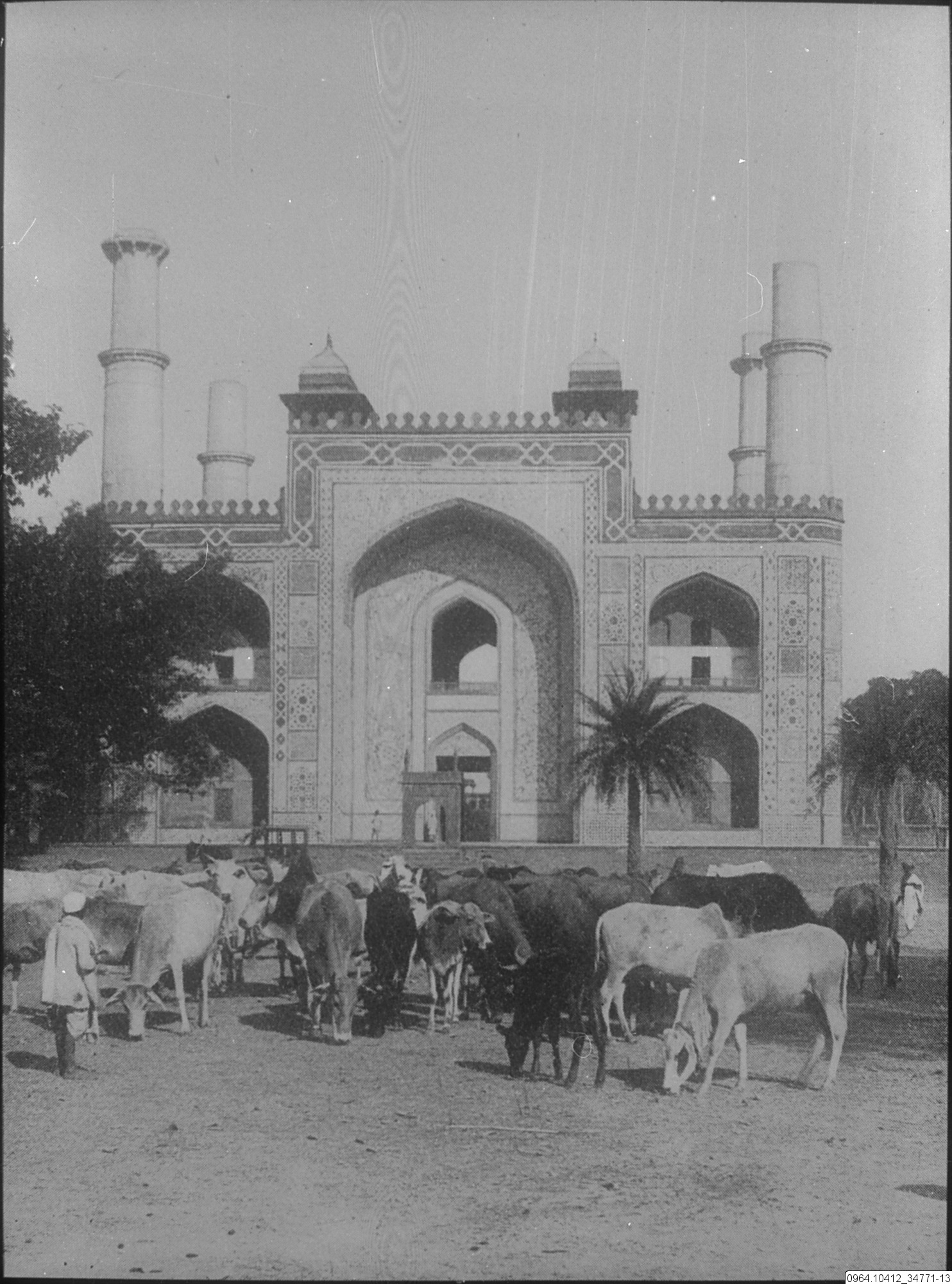 Boskap (kor) framför ett mausoleum. Akbar den stores mausoleum ligger i Sikandra, som i dag är en stadsdel i storstaden Agra i den indiska delstaten Uttar Pradesh. Detta ligger i en stor park, som omges av en hög mur av röd och vit marmor, på var och en av sina fyra sidor försedd med en praktfull portal, varifrån vägar leder till mausoleet, näst Egyptens pyramider det största, som blivit uppförd över någon människa, och en av Indiens märkvärdigaste byggnader. Den är fyra våningar hög, de tre nedre av ljusröd sten, den översta av vit marmor.