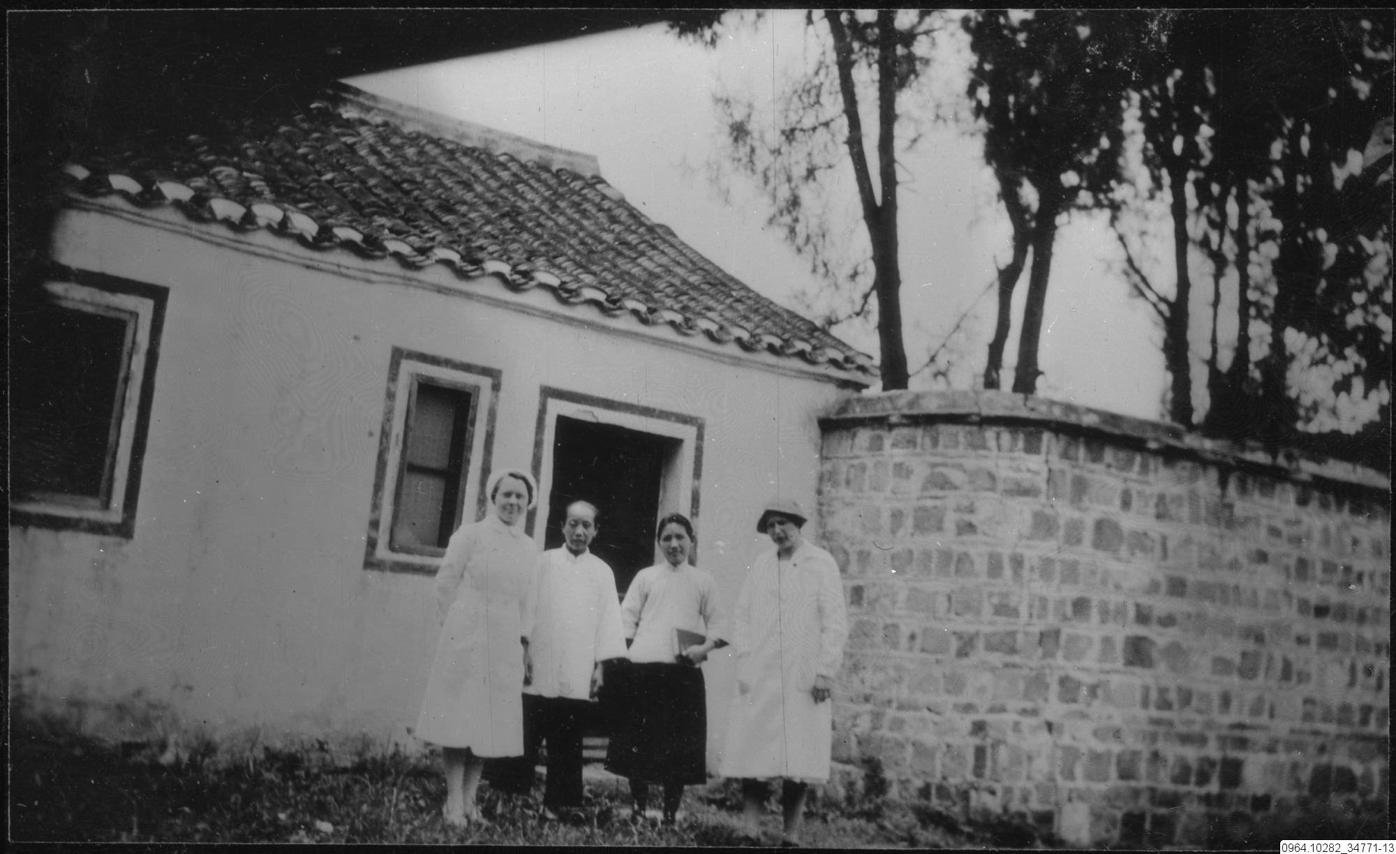 Fyra personer utanför hus, sjukhuspersonal sannolikt.