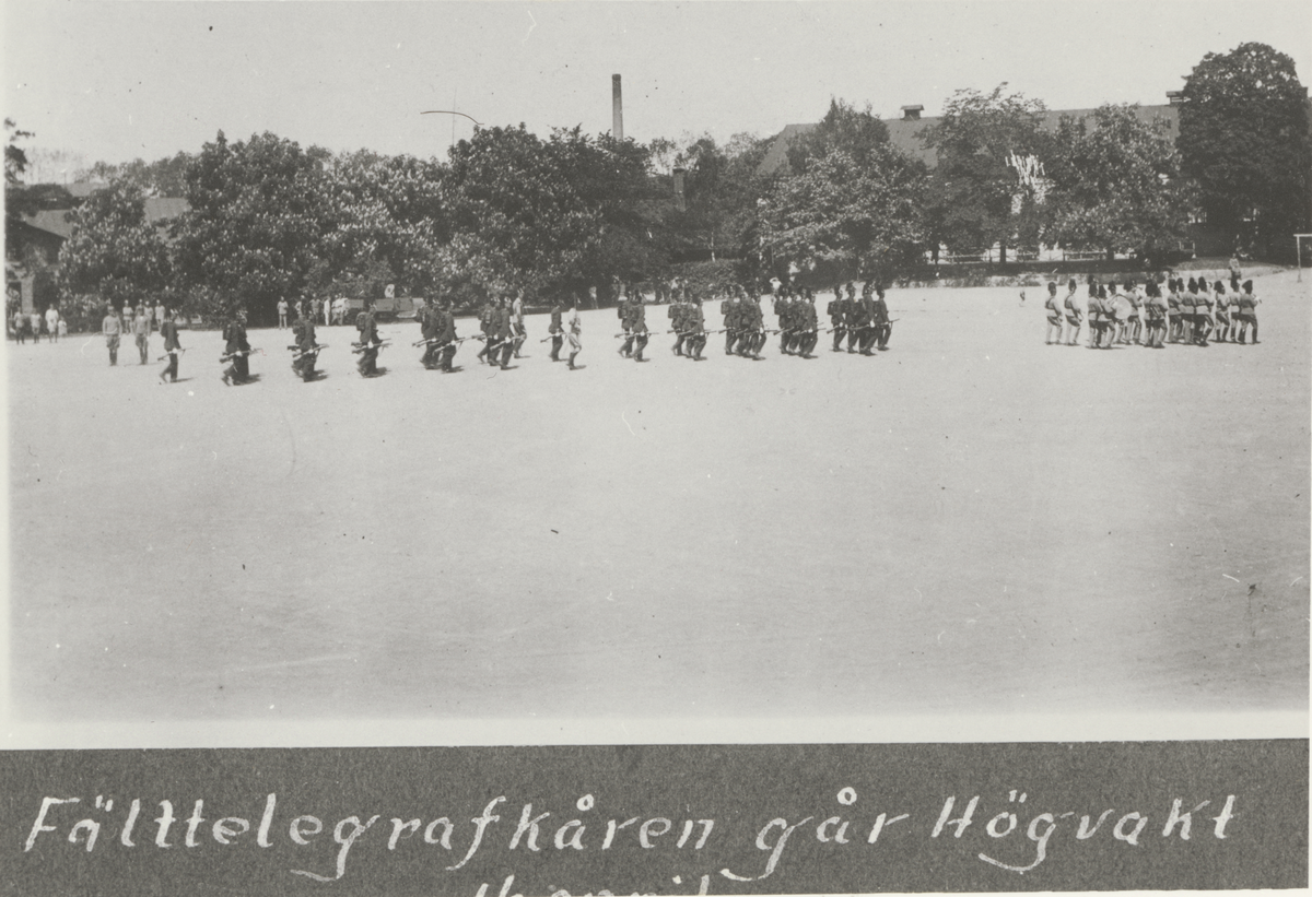 Titel: Text i bilden: "Fälttelegrafkåren går högvakt."