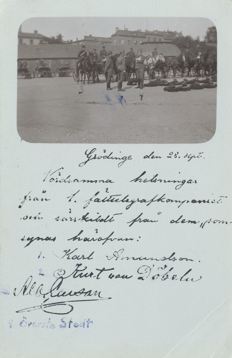 Signaltrupp med vagnar och utrustning på kaserngården. Vykort skickat till överste N. G. Stedt, 1903-09-28.