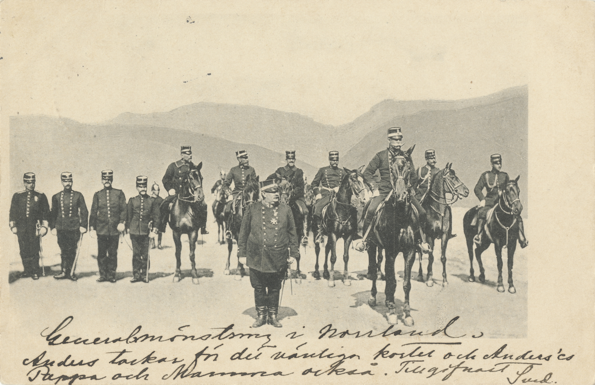 Generalmönstring i Norrland. Officerare uppställda till häst och till fots. Vykort skickat till överste N. G. Stedt, 1903.