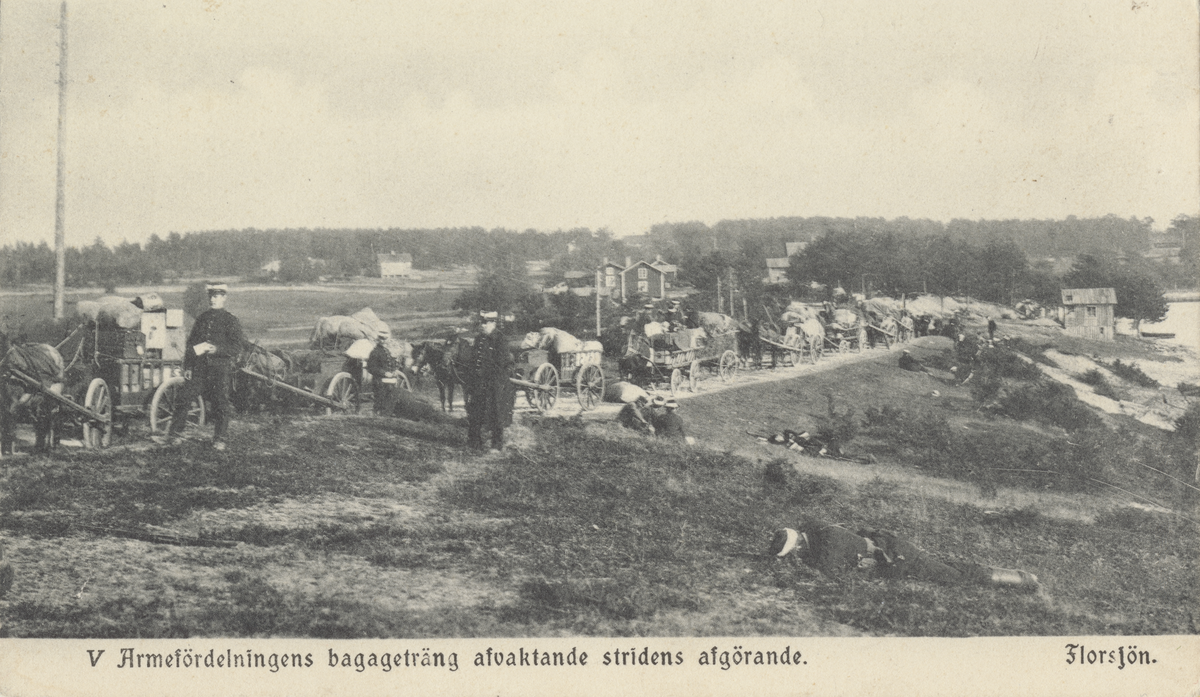 Titel: V. Arméfördelningens hästdragna bagageträng avvaktar stridens avgörande på landsväg vid Florsjön.