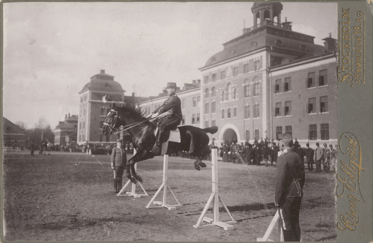 Häst hoppar över hinder vid Livregementets dragoner, med regementsbyggnaden i bakgrunden.