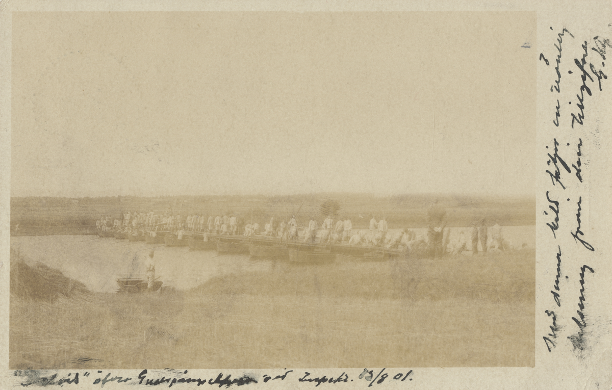Ingenjörstrupper bygger en pontonbro över en älv i ett flackt landskap. Vykort skickat till överste N. G. Stedt, 1901.