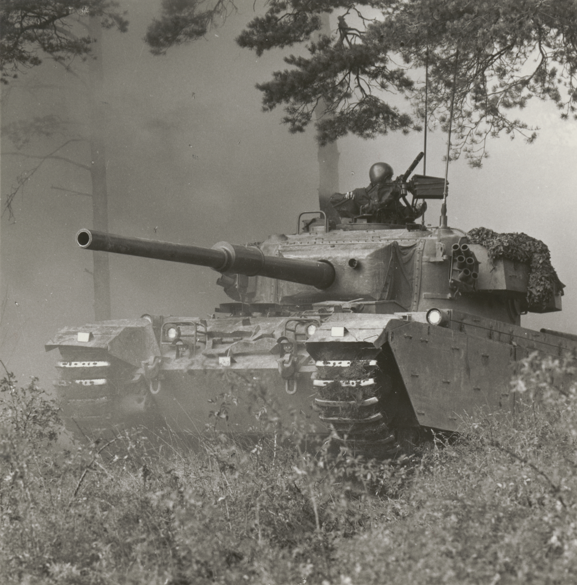Centurionstridsvagn i rökfylld skog. Vagnbefälhavaren spanar vid kulsprutan.