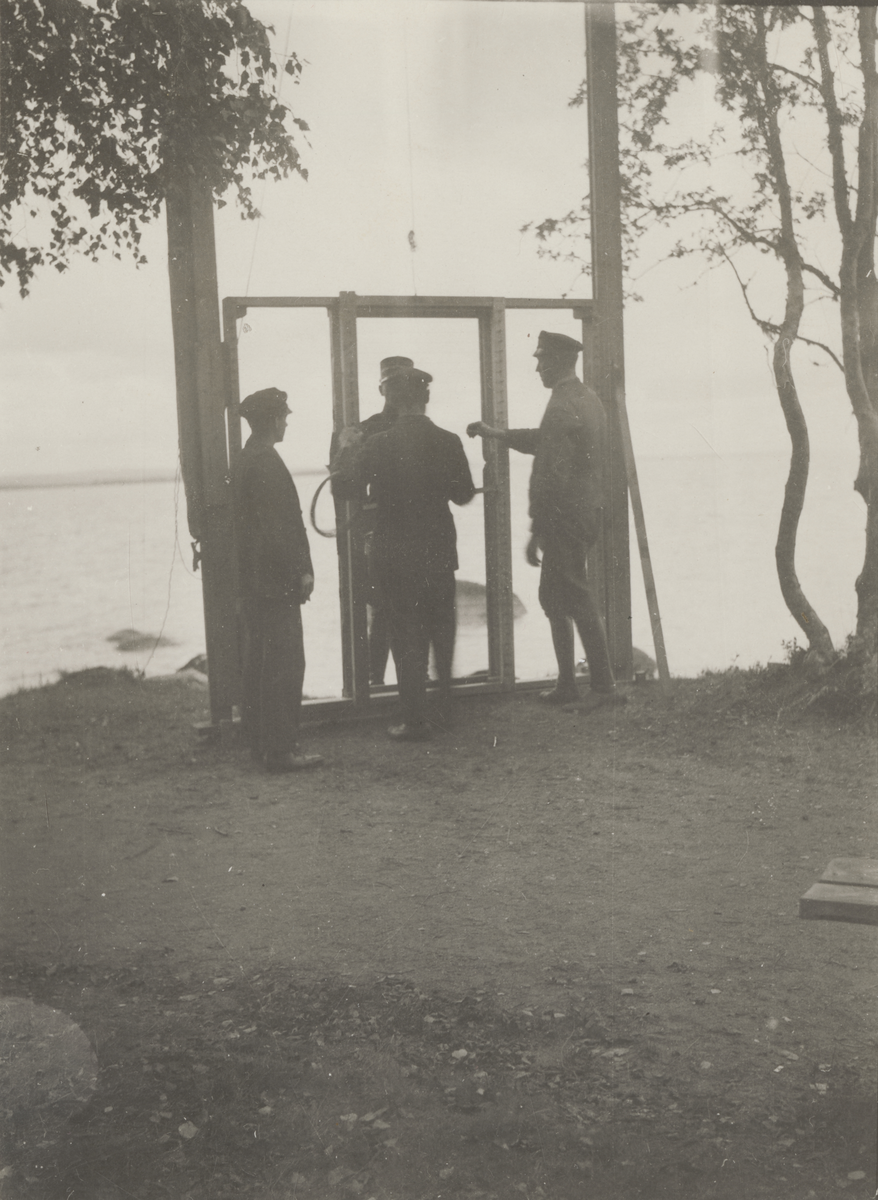 Titel: Fyra män arbetar med en träram vid strandkanten i Karlsborg.