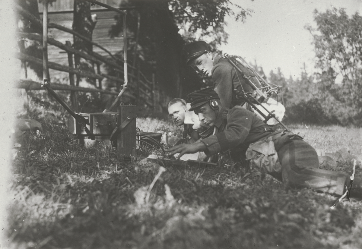Titel: Övning i fält. Tre män med en bärbar radiostation m/1929 för kortvåg sänder vid ett staket.