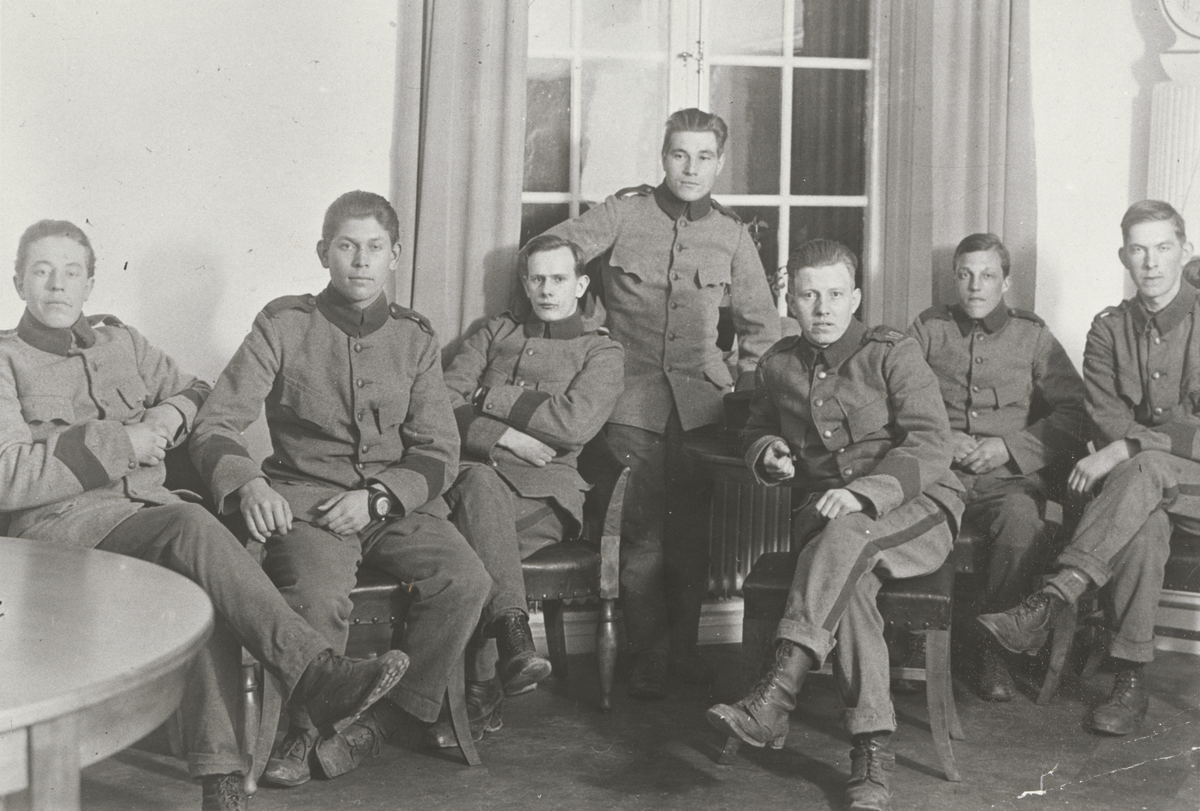 Titel: Gruppfoto på sju män som sitter vid ett fönster.