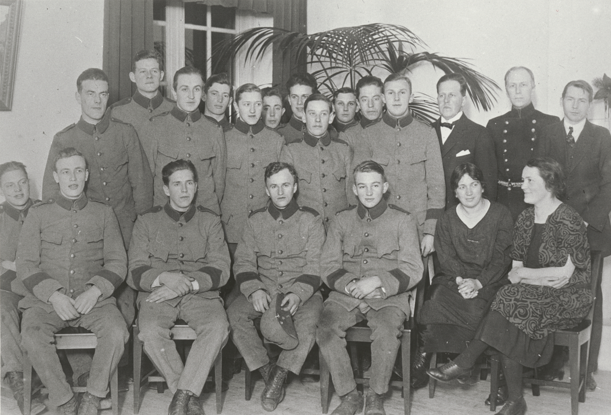 samling soldater, en officer, två civila män och två kvinnor vid ett fönster.