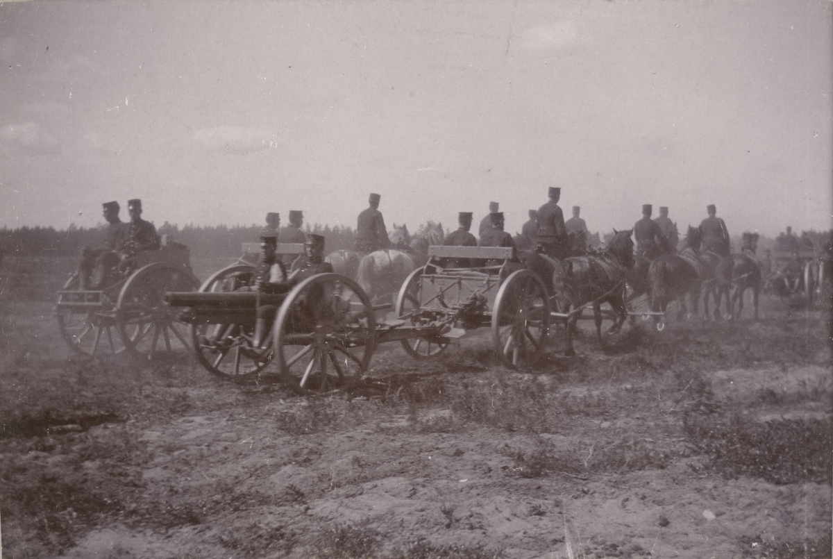 Artilleri med 7,5 cm kanon m/1902 och ammunitionsekipage bredvid.
