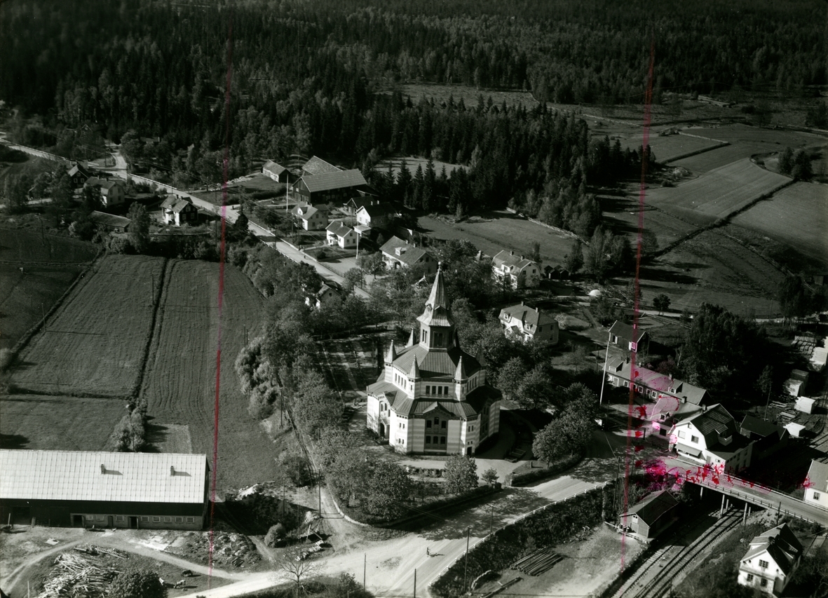 Vykortsförlaga, flygfoto över Örsjö kyrka.