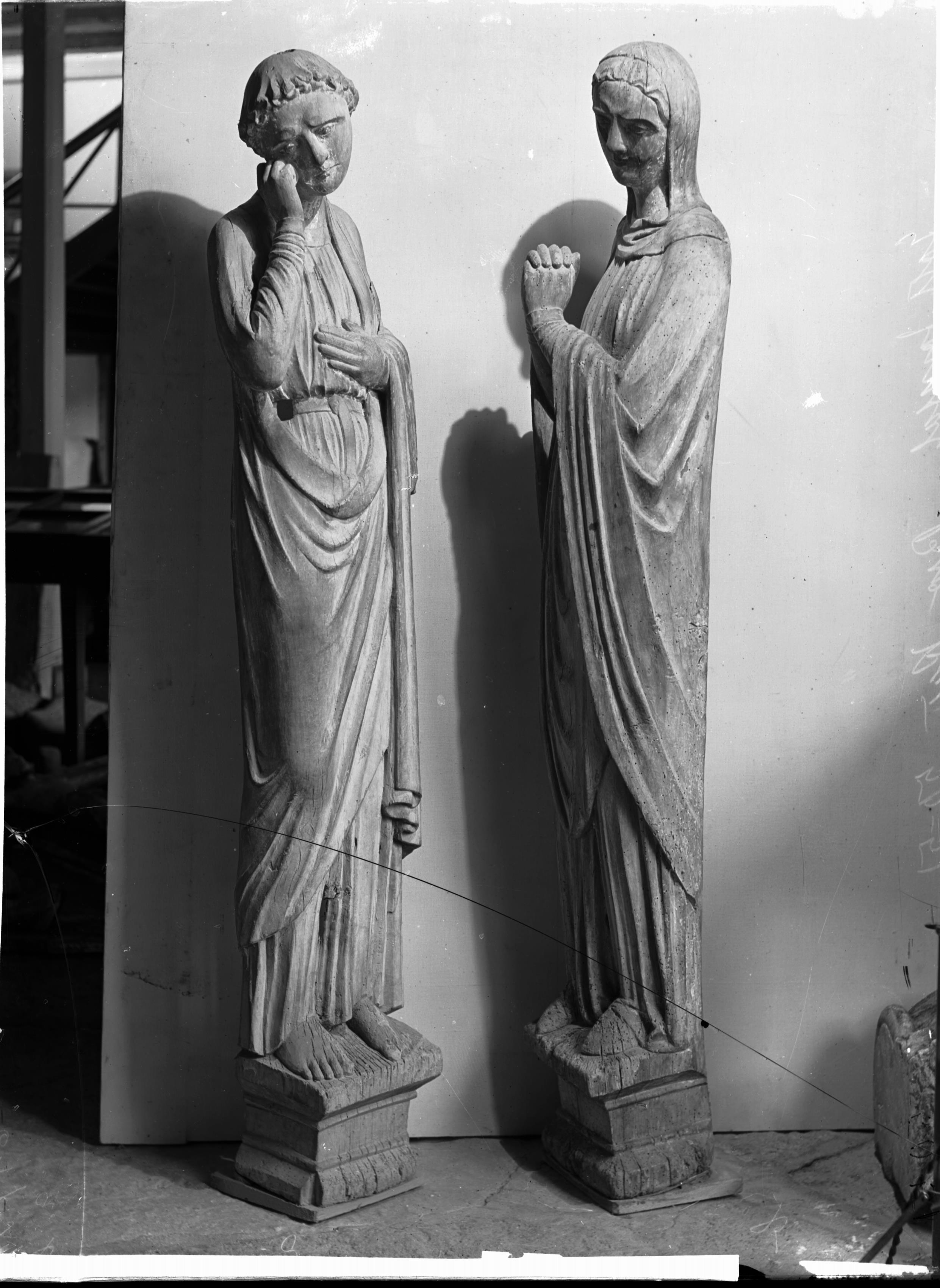 Skulptur av trä framställande den sörjande Maria och Johannes.