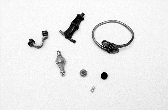 Titel: Romfartuna sn Äs RAÄ 119 Pärlor, armring, fibulor och päronformat hänge