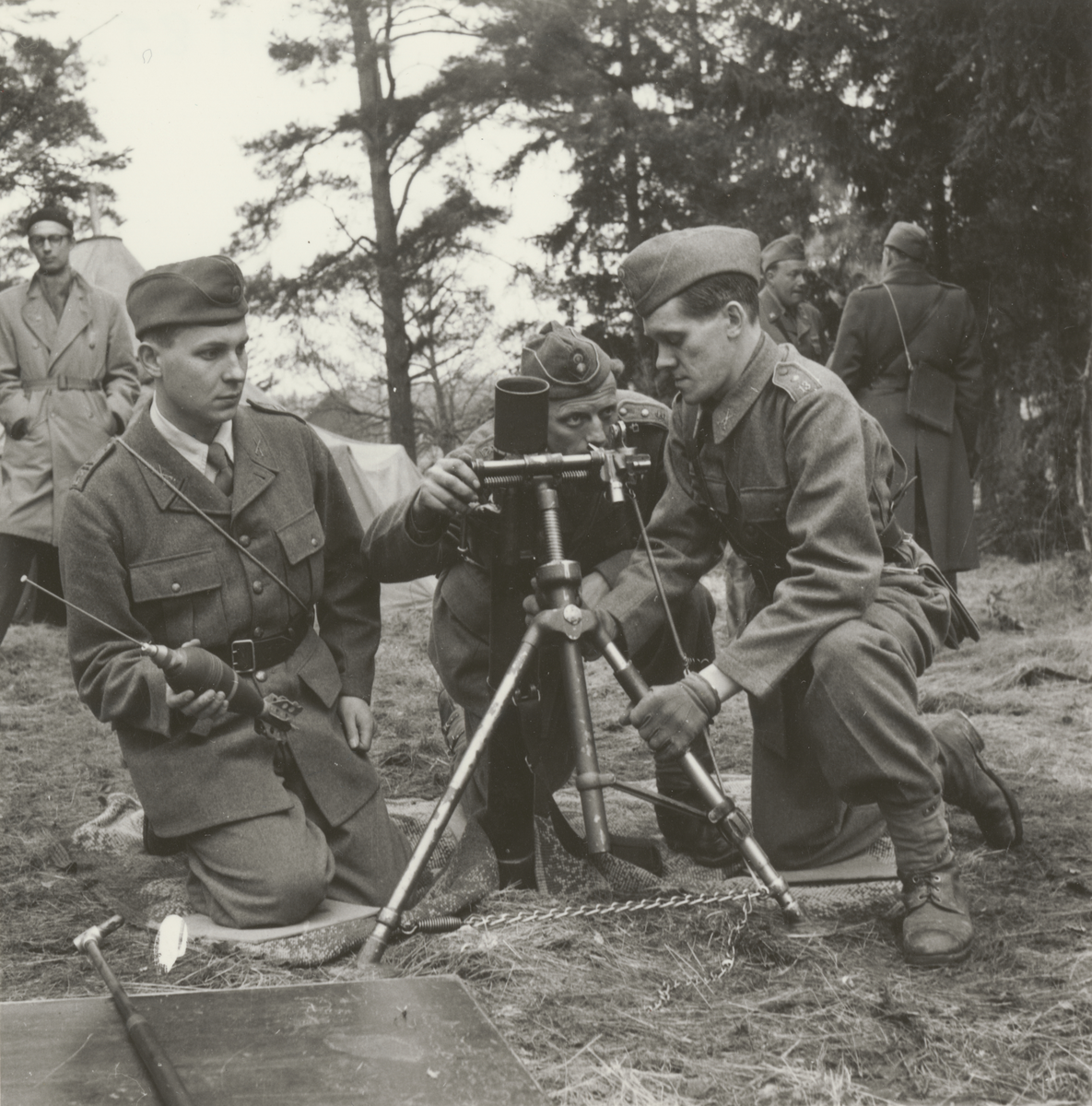 Tre män riktar in en 8 cm granatkastare m/1929.
