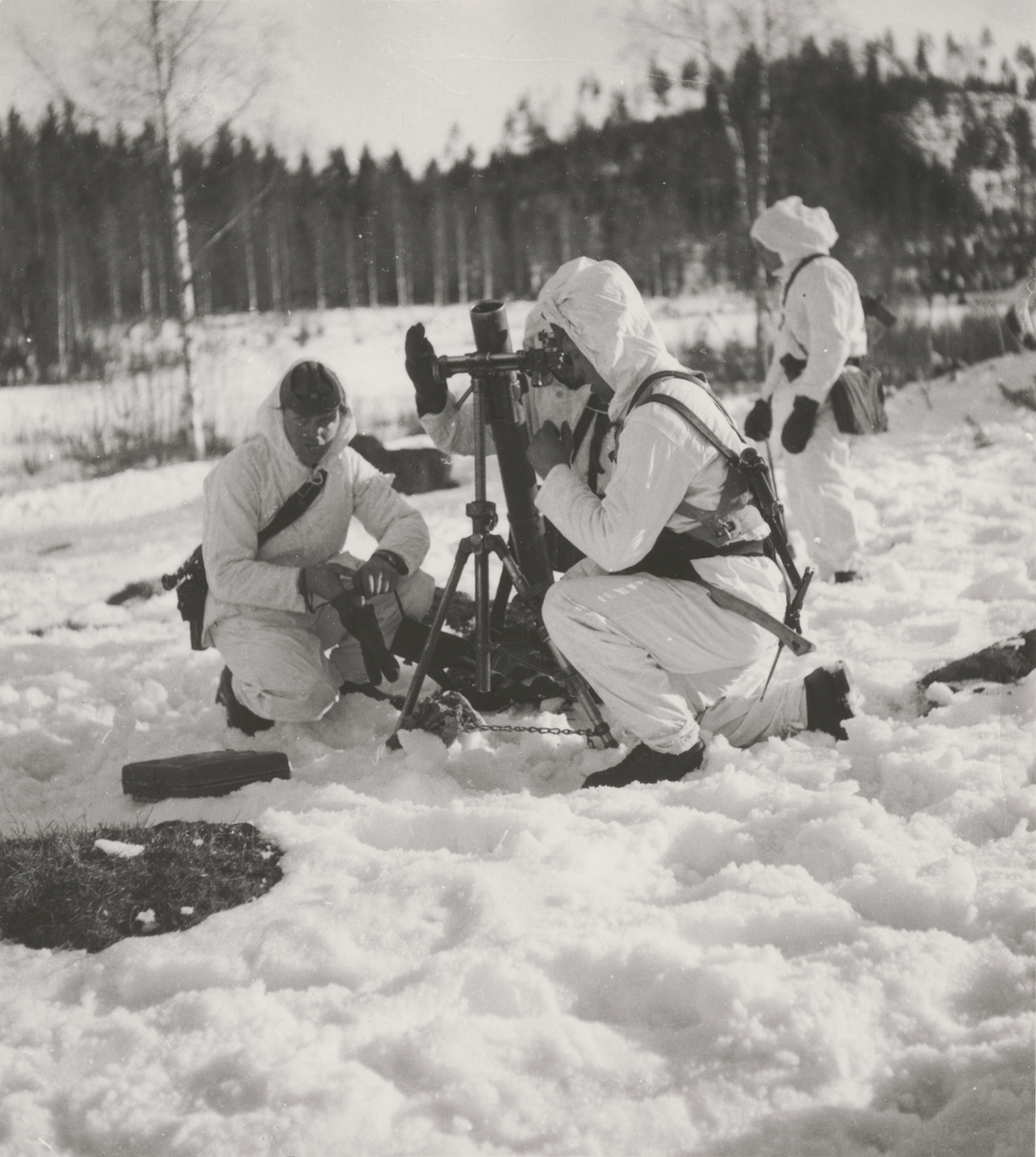 Titel: Vinterutrustade soldater riktar in en 8 cm granatkastare på ett snöigt fält.