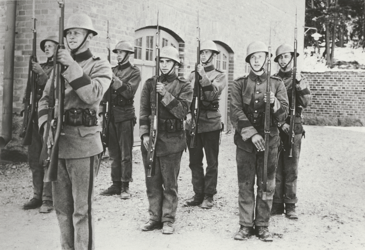 Titel: Sju män övar gevärsexercis med Mausergevär och bajonett.