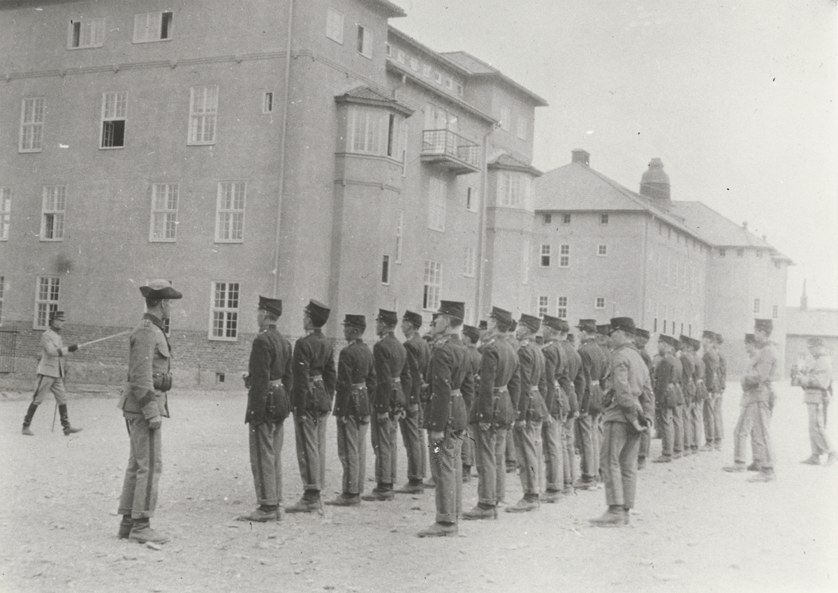 Titel: Trupp med blandad uniformering övar exercis på kaserngården.