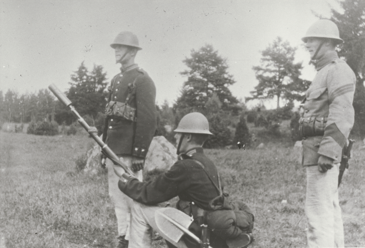 Titel: Tre soldater med en raketanordning på ett gärde.
