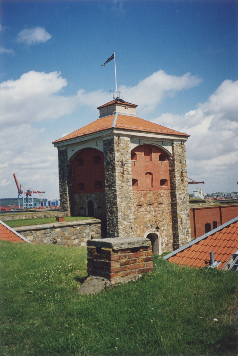 Nya Älvsborgs fästning, stora tornet, varvskranar i bakgrunden.