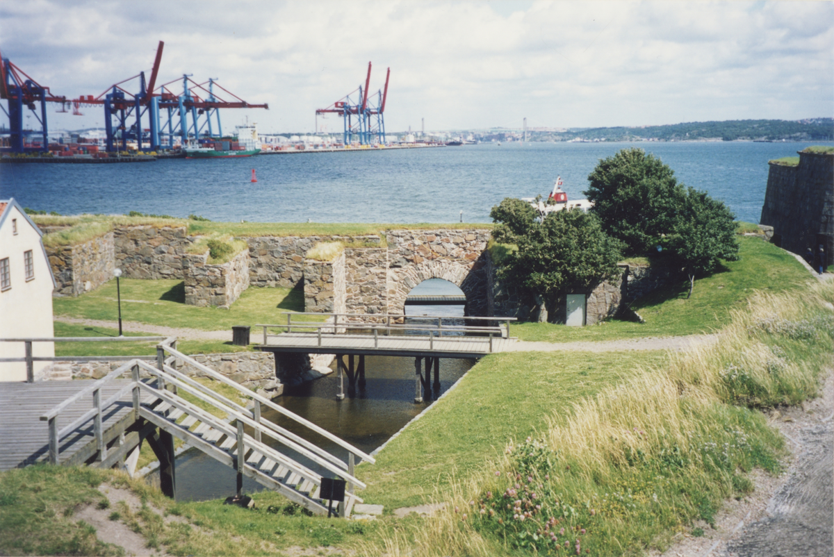 Nya Älvsborgs fästning, mur med varvskranar i bakgrunden.