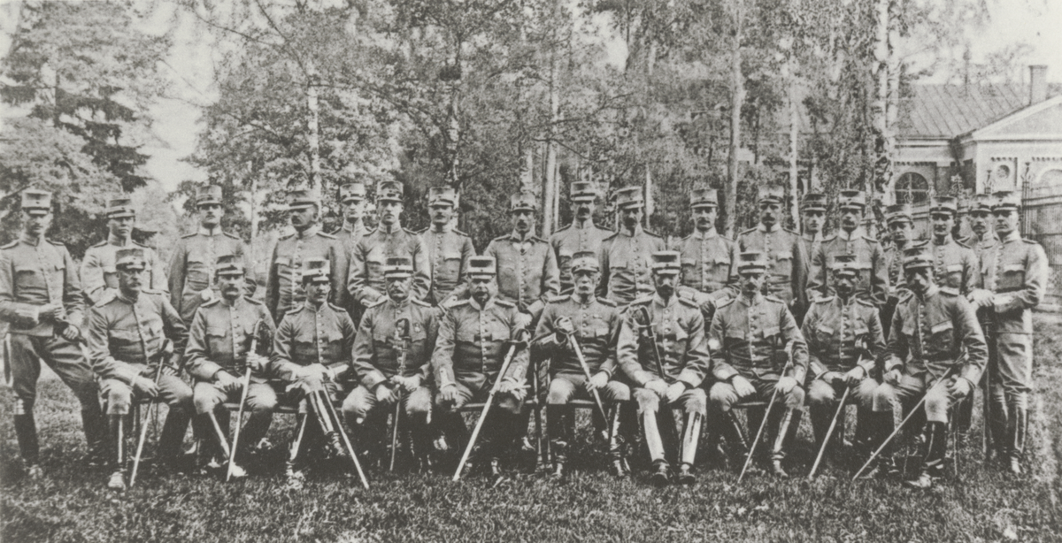 Titel: Livgardet till häst. Officerskåren poserar i lummig grönska.