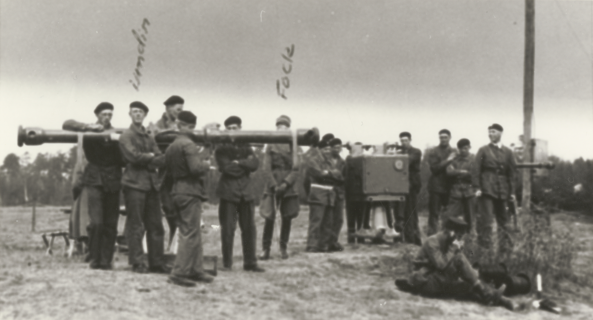 Titel: Personal från Bofors arbetar med avstånds- och centralinstrument. Vissa bär firmabaskrar.