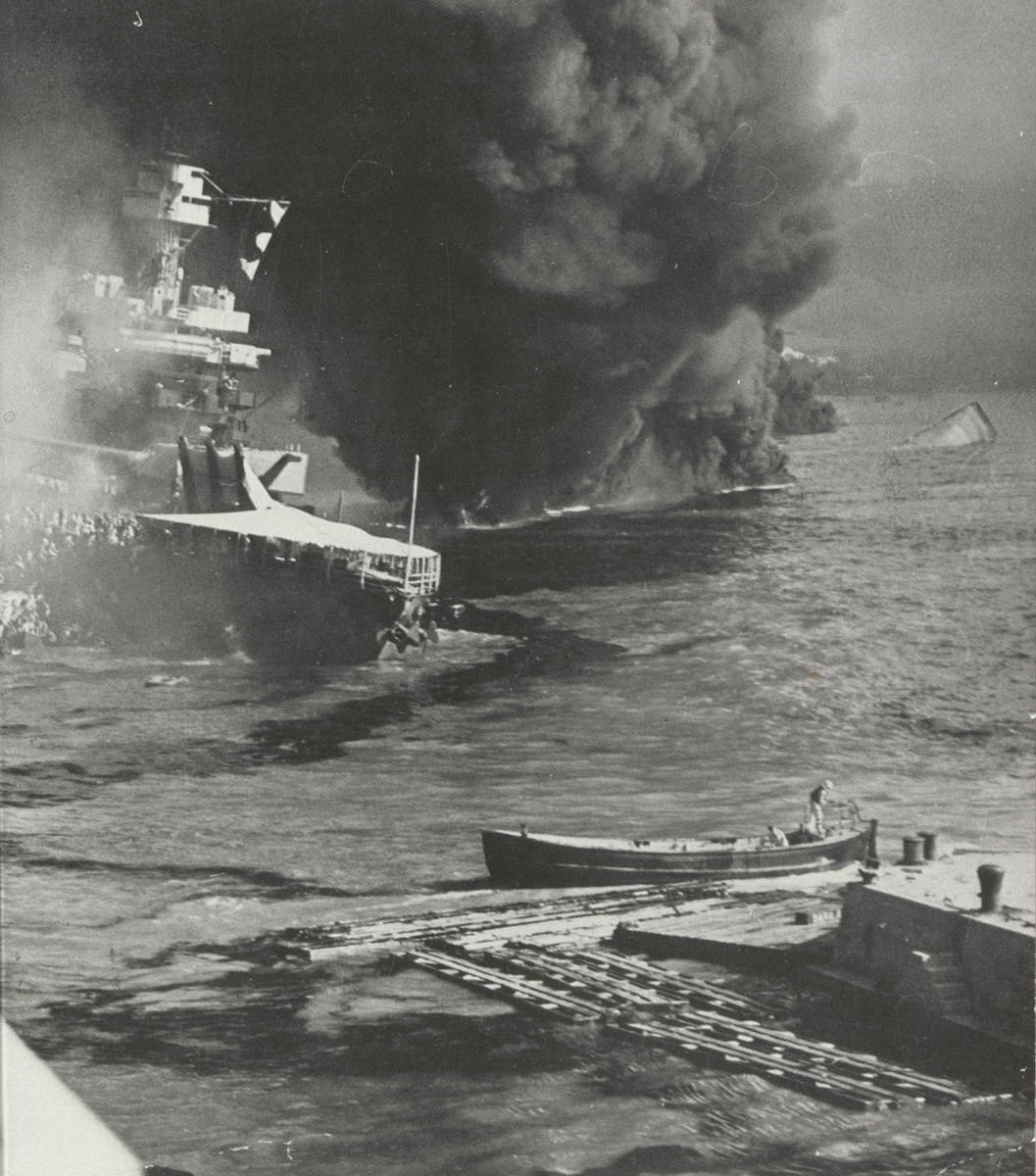 Pearl Harbor, slagskepp i brand, 7 december 1941.