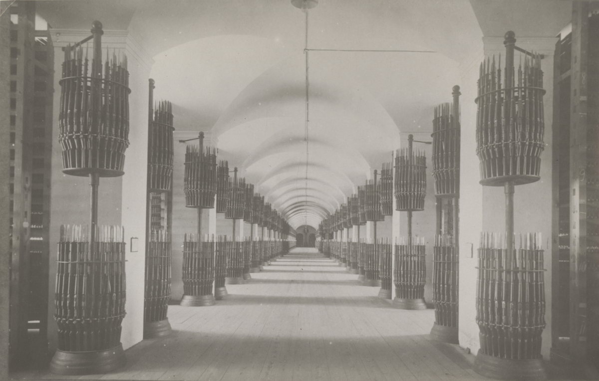Karlsborgs tygstation, hall med gevärsställ fyllda med gevär m/1896.