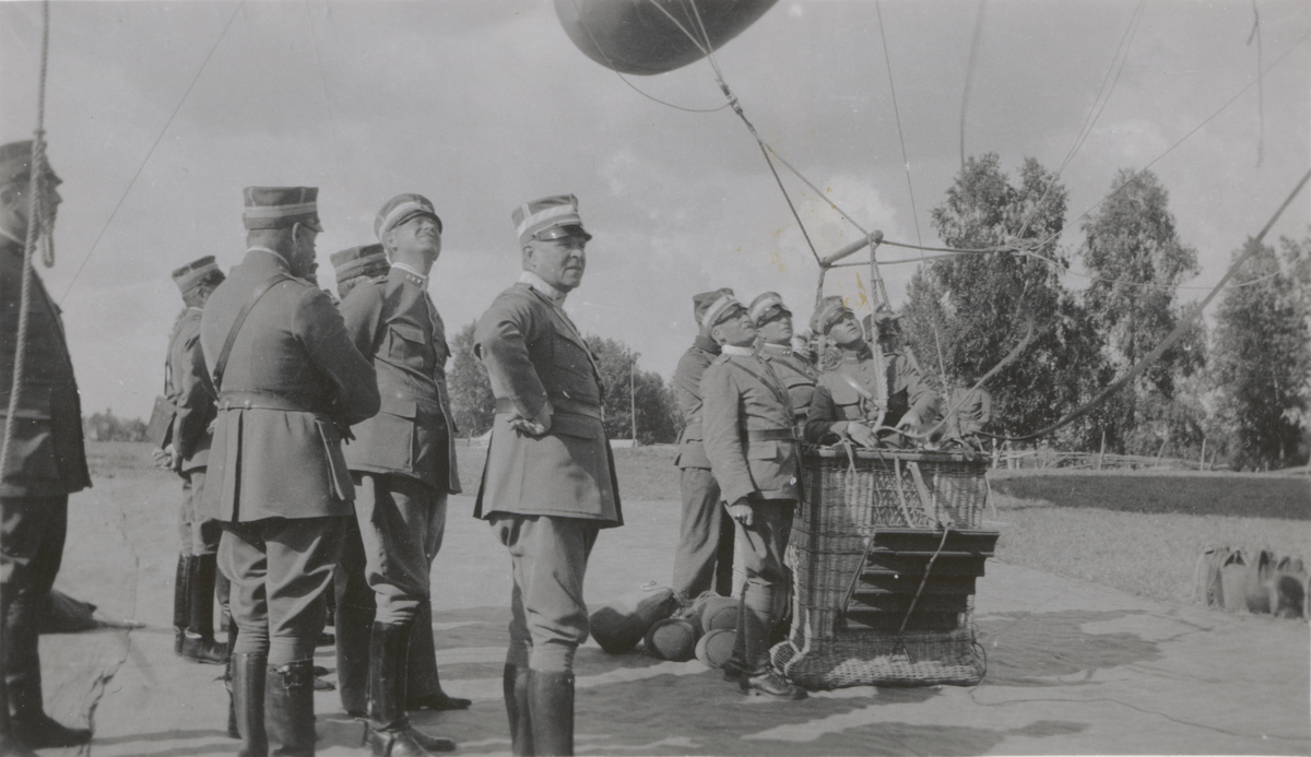 Titel: Kapten Yngve Stiernspetz i ballongkorgen under inspektion.